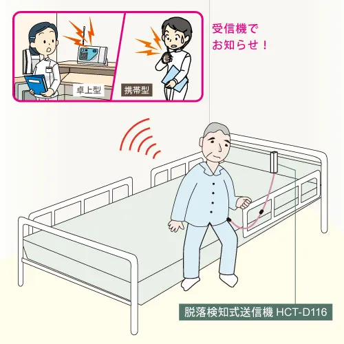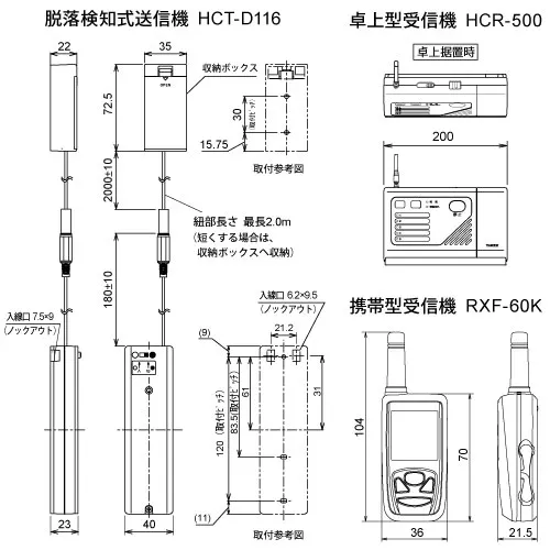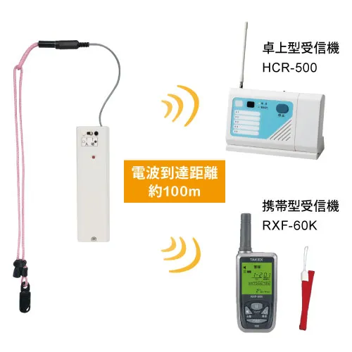 ・脱落検知式送信機「HCT-D116」と卓上型ワイヤレス受信機「HCR-500」/ 携帯型受信機「RXF-60K」の組み合わせ商品です。